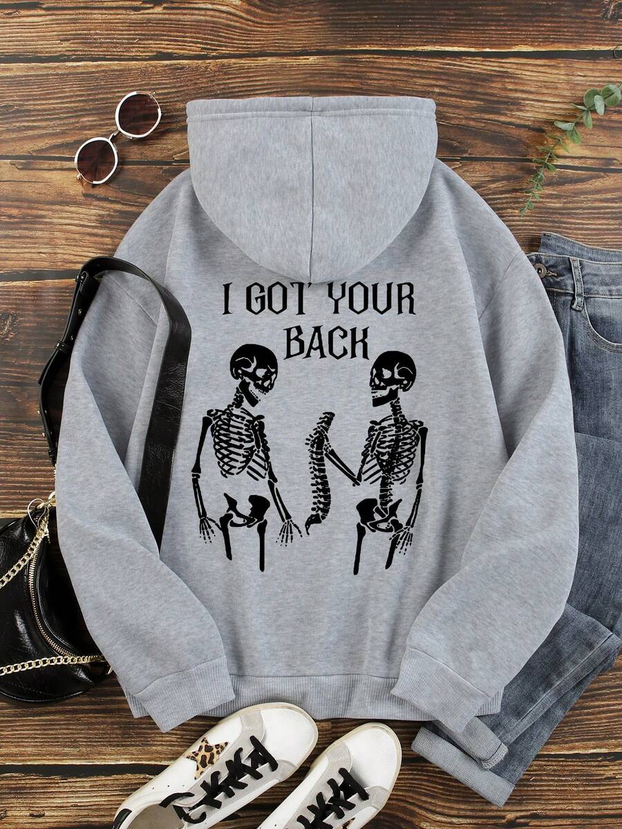 SHEIN Coolane Skeleton & Slogan Graphic Drawstring Thermal Lined Hoodie