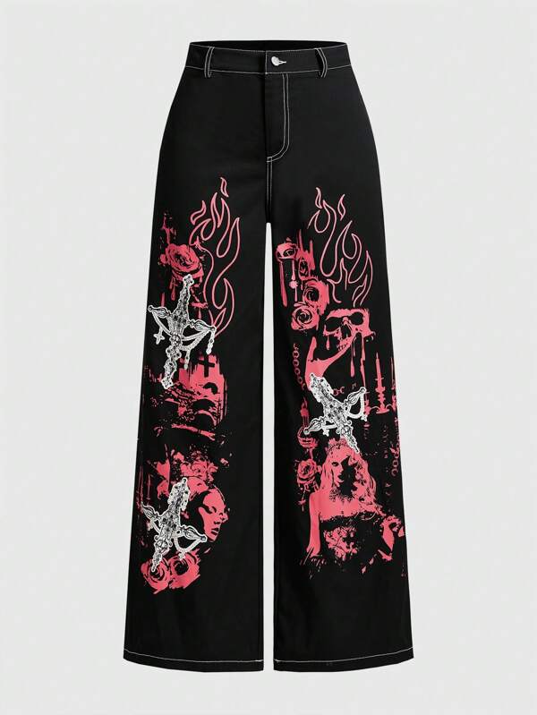 ROMWE PUNK Skull & Fire Print Wide Leg Pants