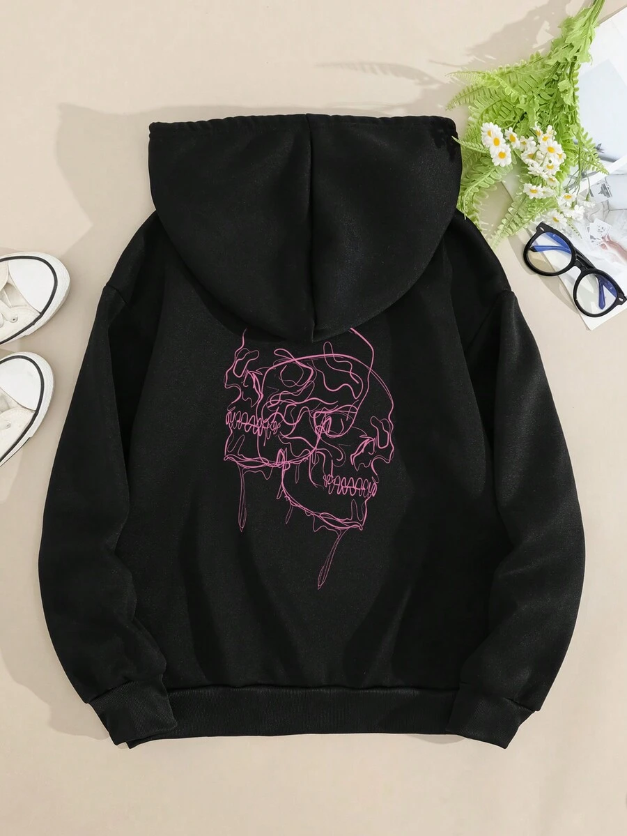 Skull Print Kangaroo Pocket Drawstring Thermal Lined Hoodie