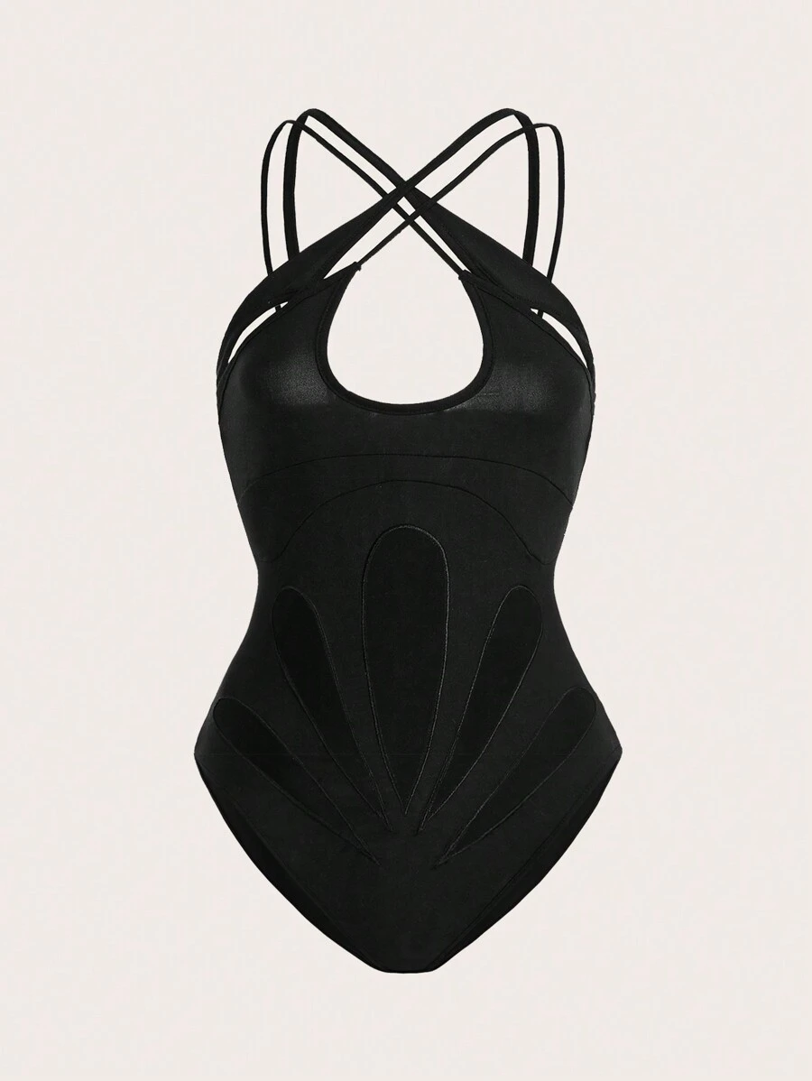 SHEIN ICON Slim-Fit 2 In 1 Cross Strap Mesh Stitching Bodysuit