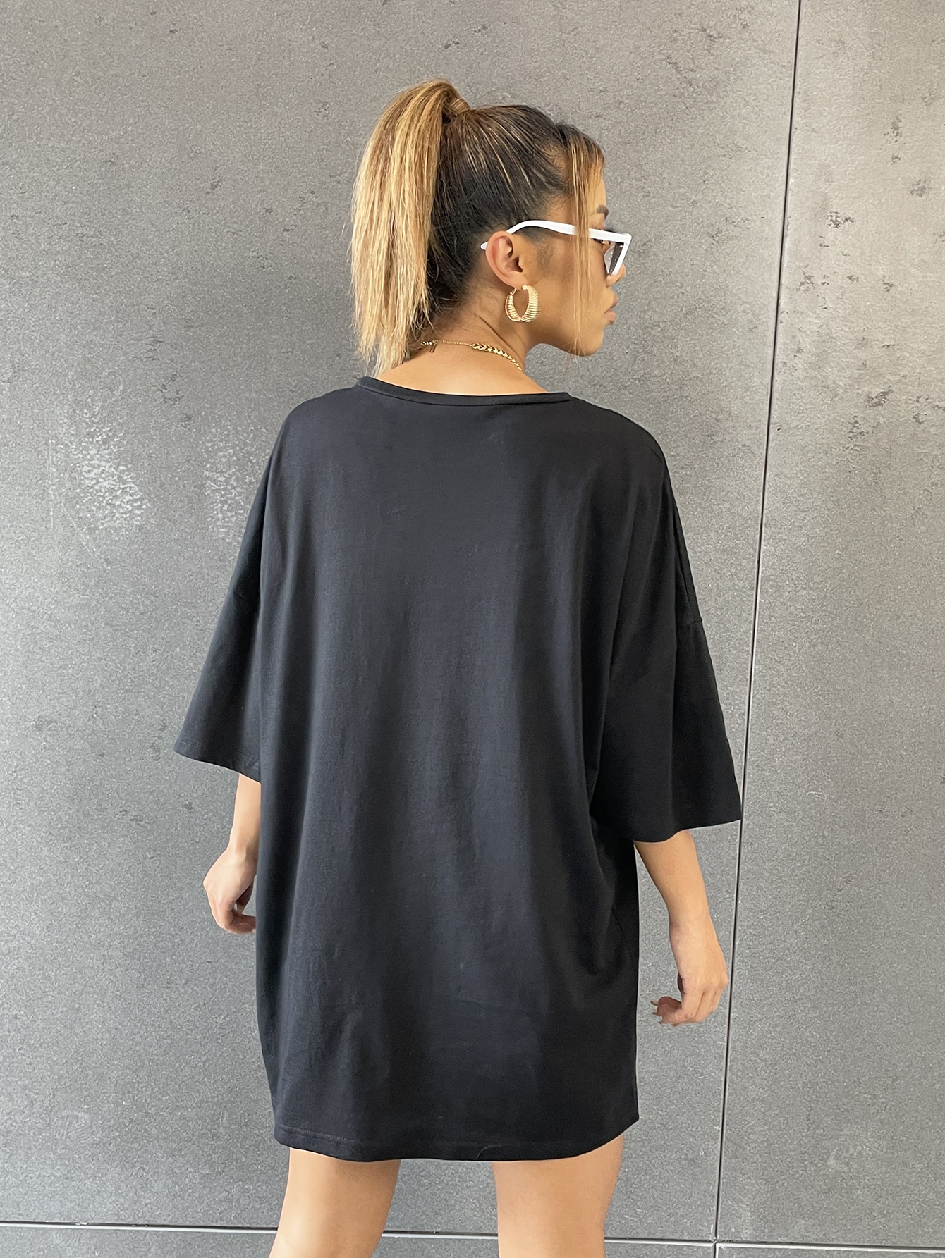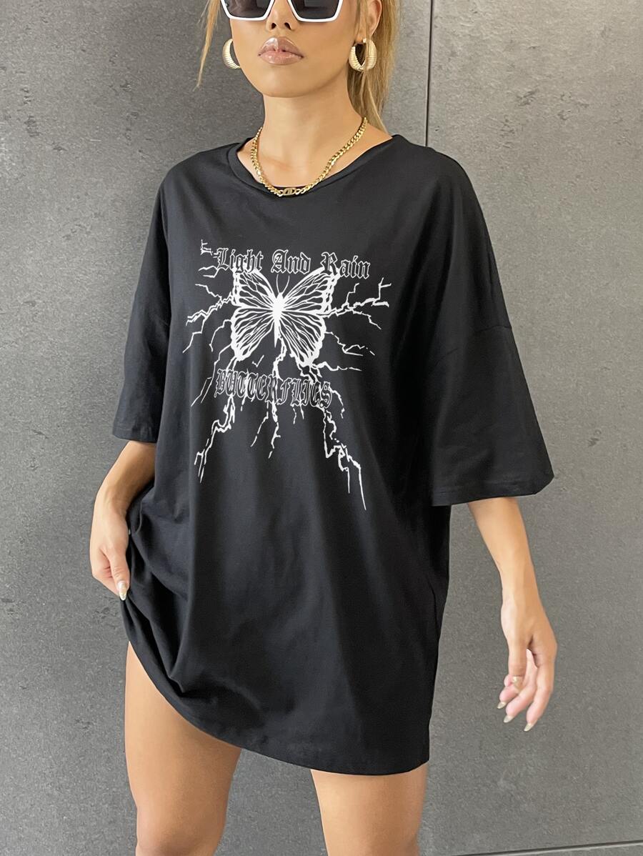 Slogan & Butterfly Print Drop Shoulder Oversized Tee