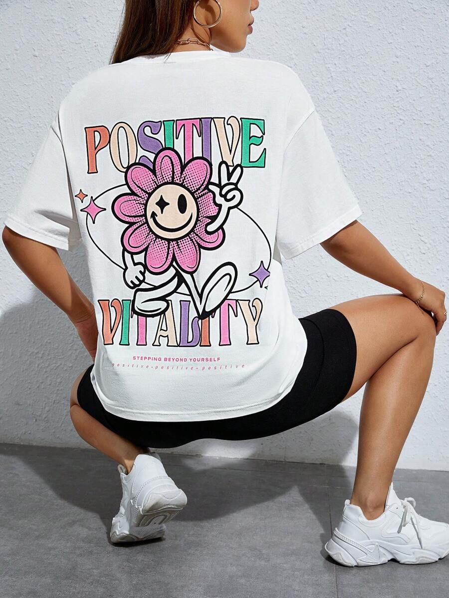SHEIN PETITE Slogan & Cartoon Graphic Drop Shoulder Oversized Tee