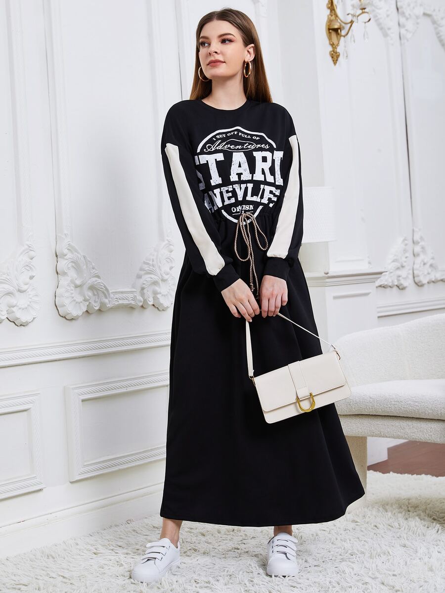 SHEIN Mulvari Slogan Graphic Drop Shoulder Drawstring Waist Dress