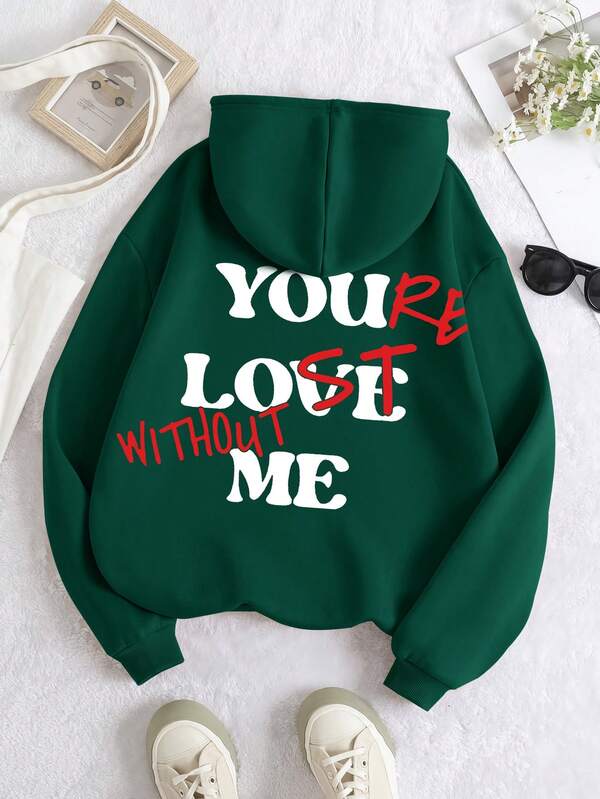 Slogan Graphic Kangaroo Pocket Drawstring Thermal Lined Hoodie