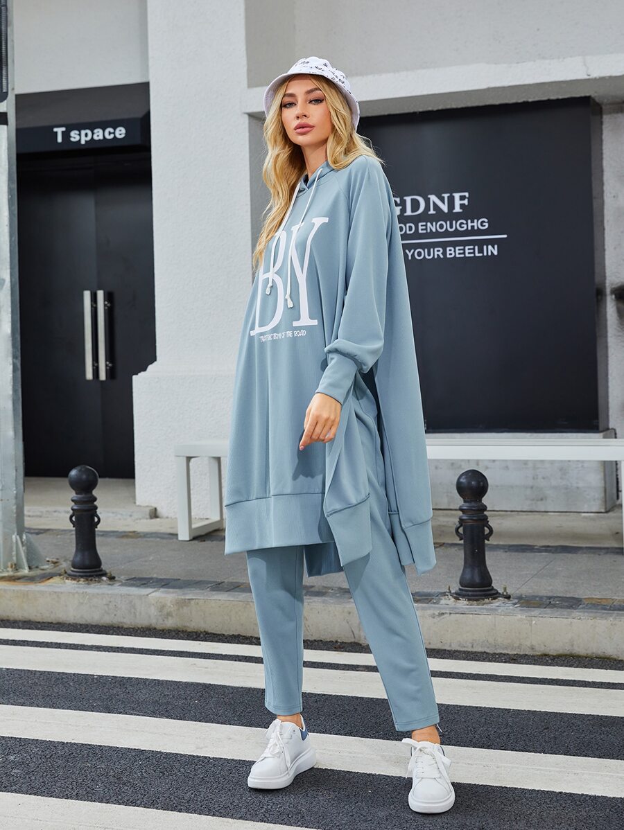 SHEIN Mulvari Slogan Graphic Raglan Sleeve Drawstring Hoodie & Pants