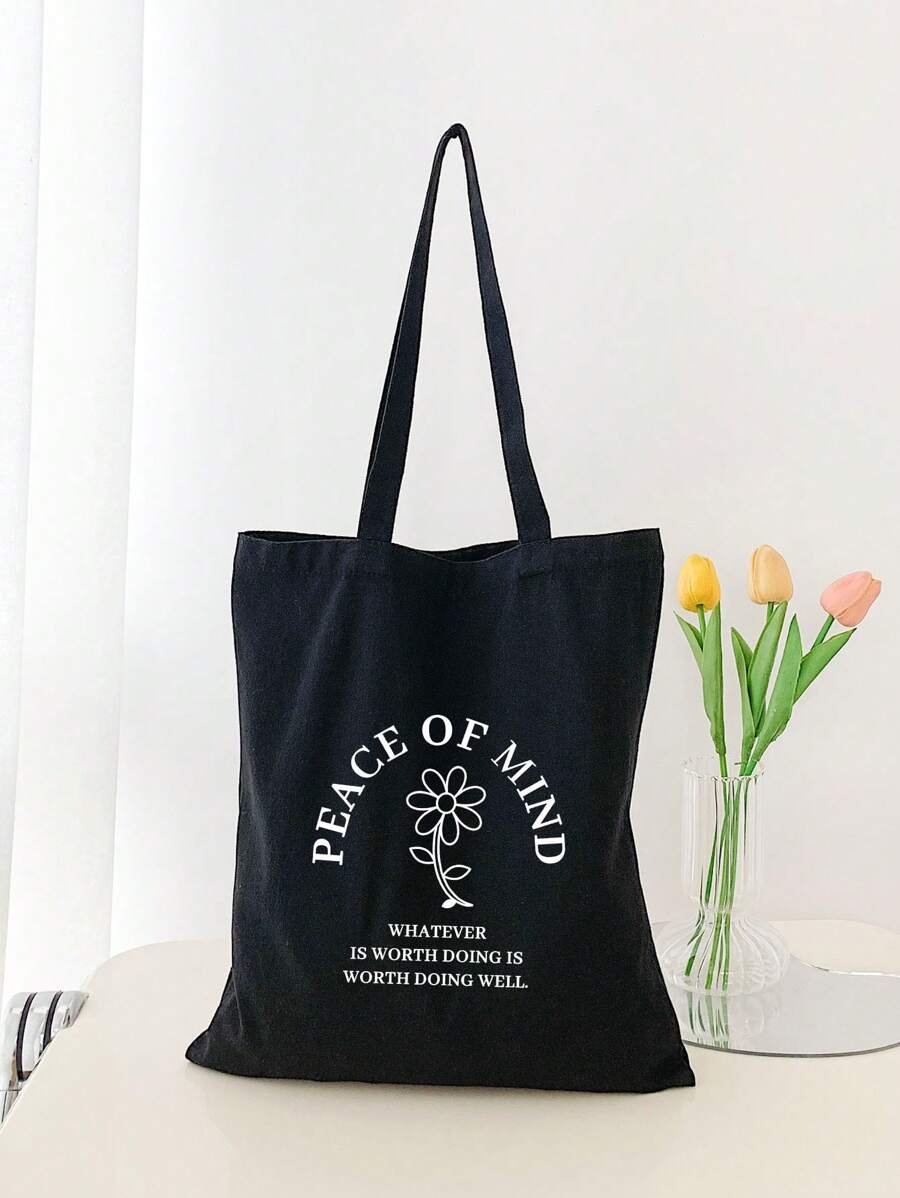 Small Shopper Bag Letter & Floral Graphic Preppy School Bag For Graduate, Teen Girls, Freshman, Sophomore, Junior & Senior In College, University & High School, Perfect For Outdoors ,Travel & Back To School