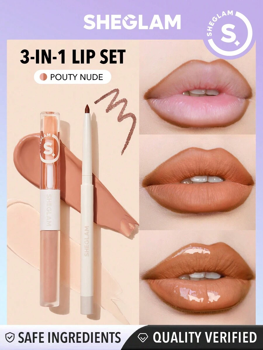 SHEGLAM Soft 90's Glam Lip Liner And Lip Duo Set-Pouty Nude Lip Set 3-In-1 Lip Makeup Plumping Lip Gloss Moisturizing Plant Extracts Long Lasting Liquid Lipstick Lip Makeup Black Friday Winter Brown Liquid Lipstick