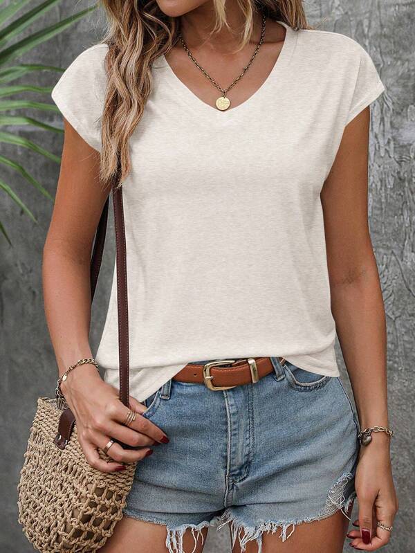 SHEIN VCAY Solid Batwing Sleeve V Neck Tee