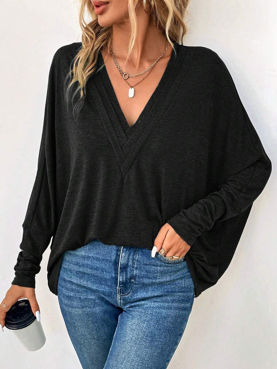 SHEIN LUNE Solid Batwing Sleeve V Neck Tee