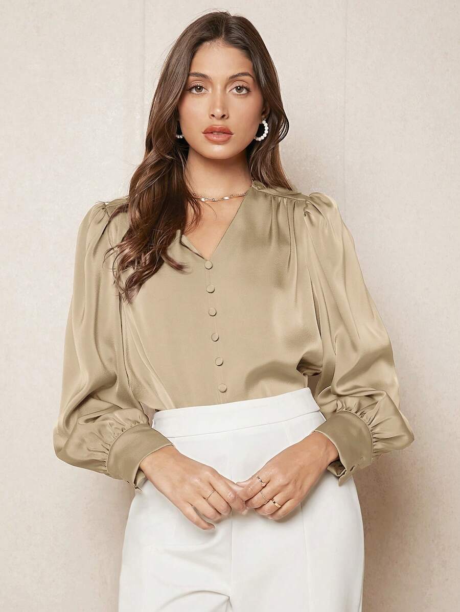 SHEIN BIZwear Solid Button Front Lantern Sleeve Satin Top