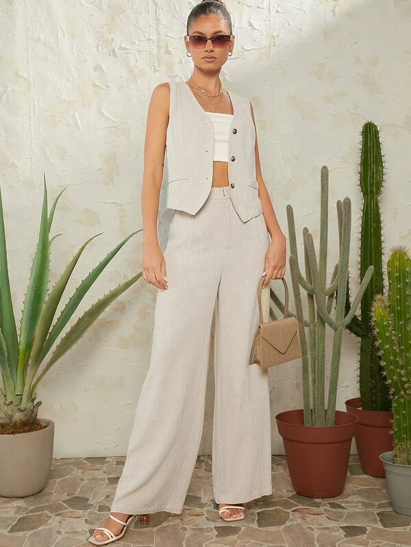 SHEIN VCAY Solid Button Front Vest Blazer & Wide Leg Pants