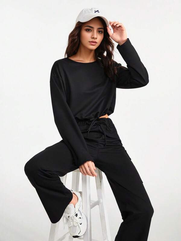 Daily&Casual Solid Color Drawstring Sports 2-piece Set