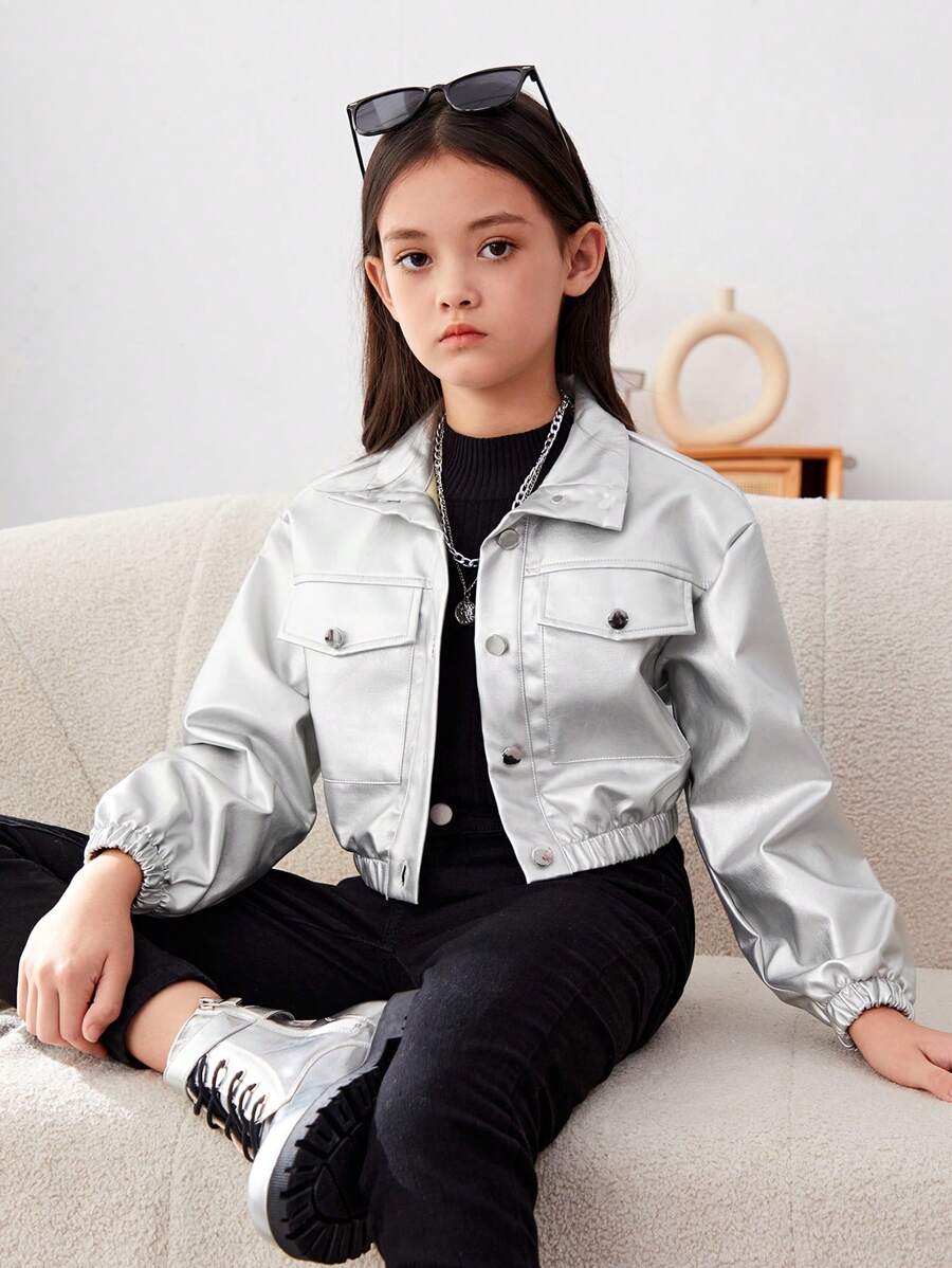 SHEIN Solid Color Short Pu Leather Jacket With Flap Pockets For Tween Girls