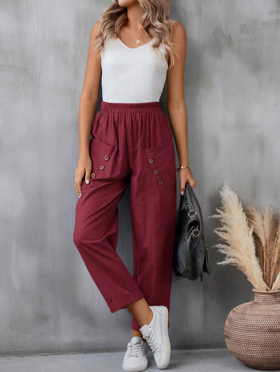 SHEIN LUNE Solid Color Women'S Long Pants With Button Detail And Double Pockets