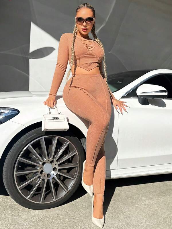 SHEIN SXY Solid Cut Out Front Crop Tee & Leggings