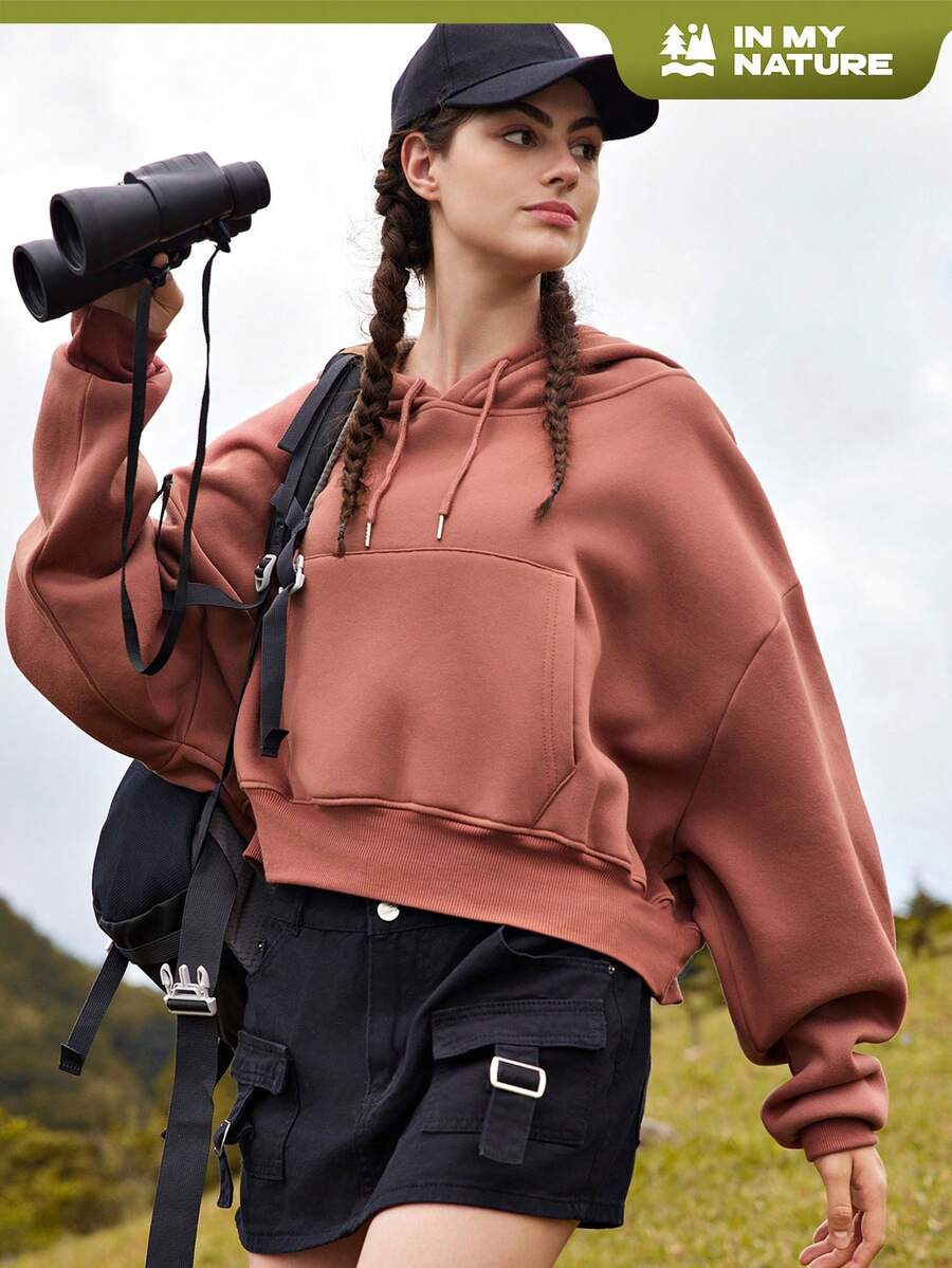 SHEIN In My Nature Solid Drawstring Crop Outdoor Hoodie