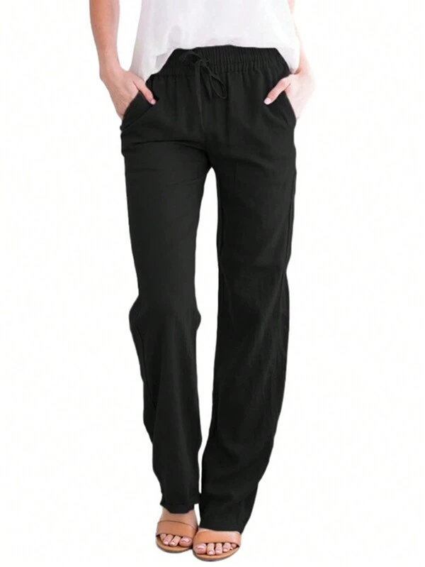 Solid Drawstring Waist Straight Leg Pants