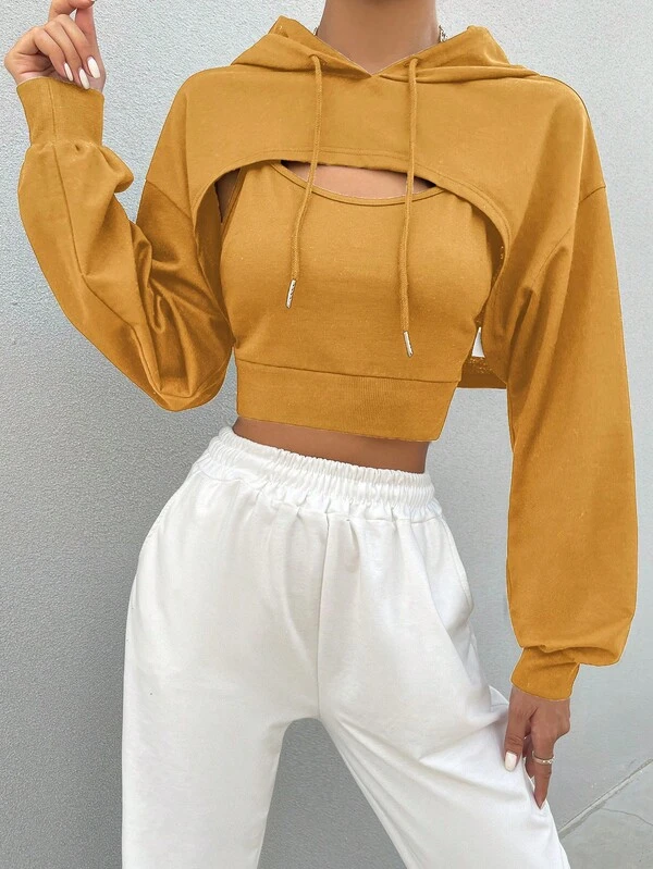 Solid Drop Shoulder Super Crop Drawstring Hoodie & Cami Top