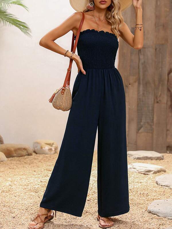 SHEIN VCAY Solid Frill Trim Tube Wide Leg Jumpsuit
