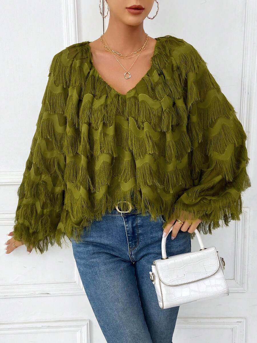 SHEIN Privé Solid Fringe Trim Lantern Sleeve Blouse