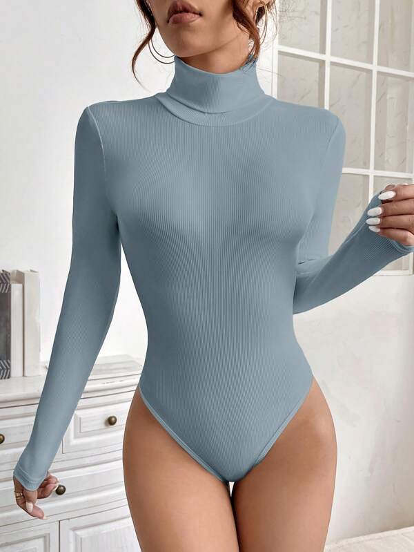 SHEIN PETITE Solid High Neck Ribbed Knit Bodysuit