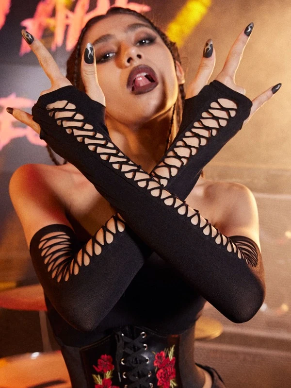 ROMWE Grunge Punk Solid Hollow Out Long Fingerless Gloves