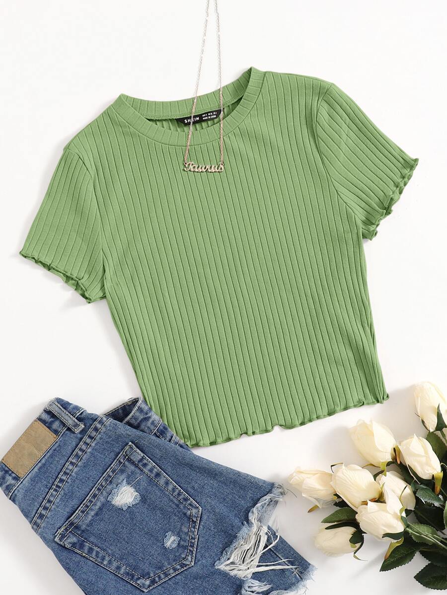 SHEIN Qutie Solid Lettuce Trim Rib-knit Tee