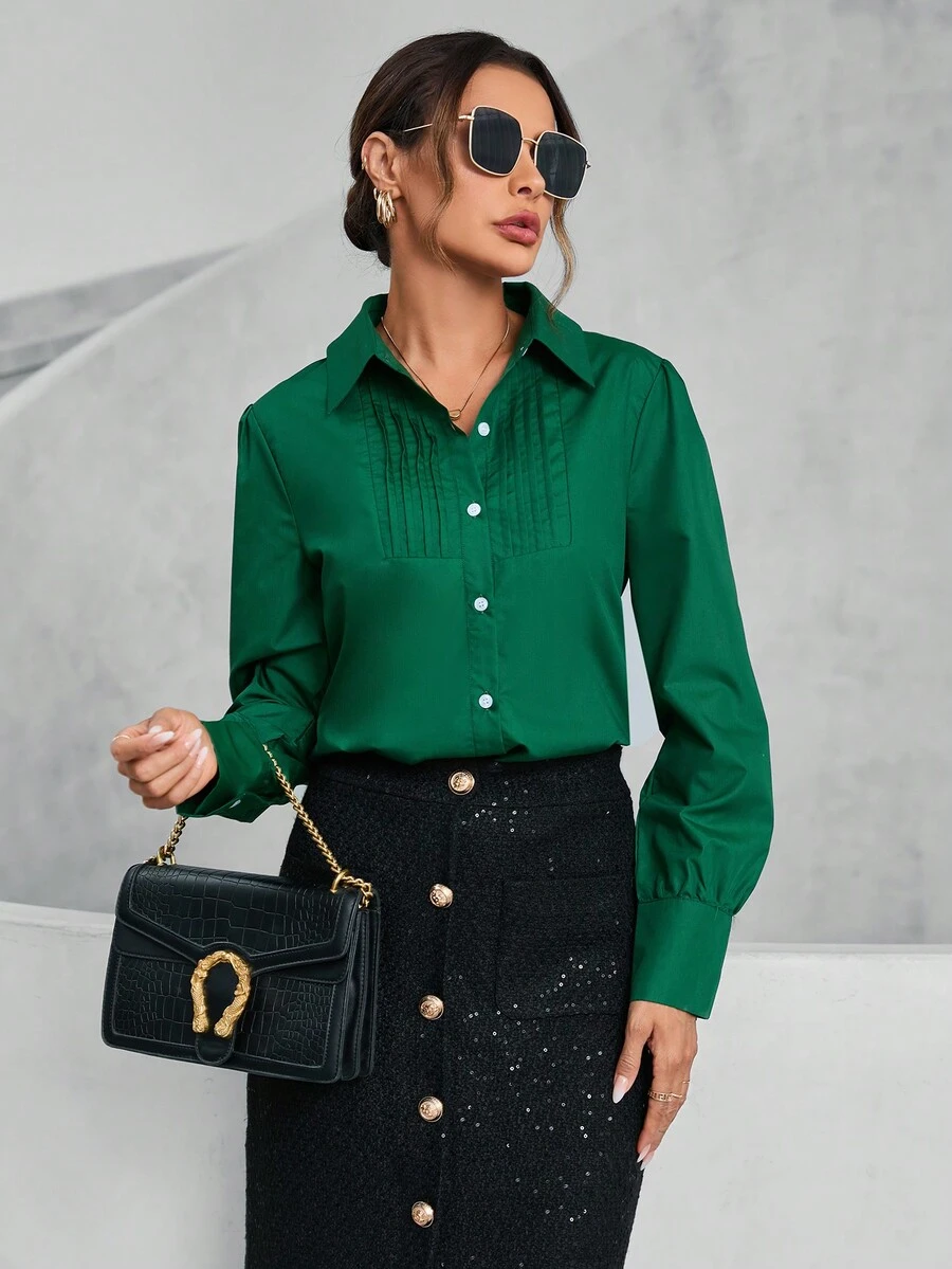 SHEIN Privé Solid Pleated Detail Button Front Shirt