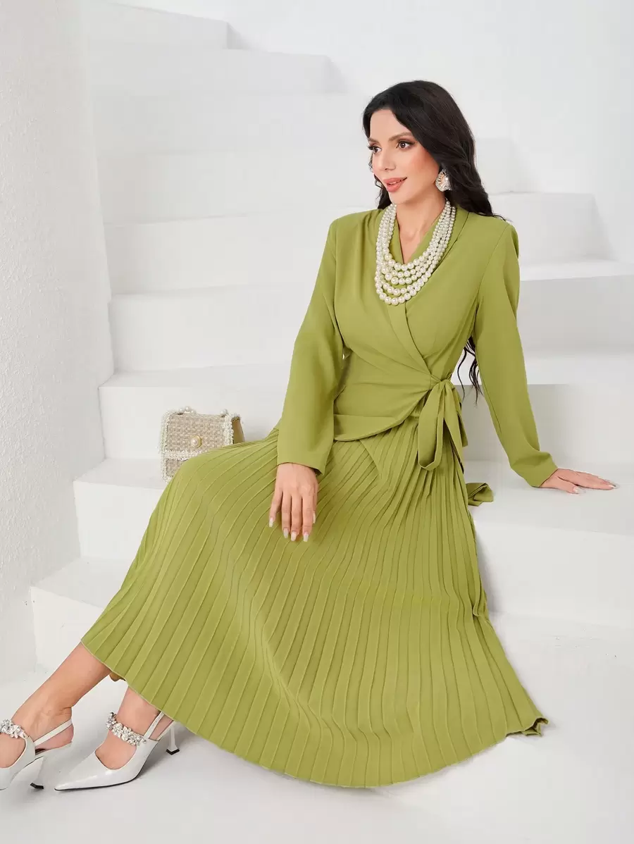 SHEIN Modely Solid Pleated Hem Knot Side Wrap Knot Side Dress