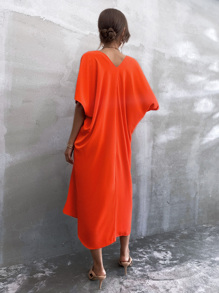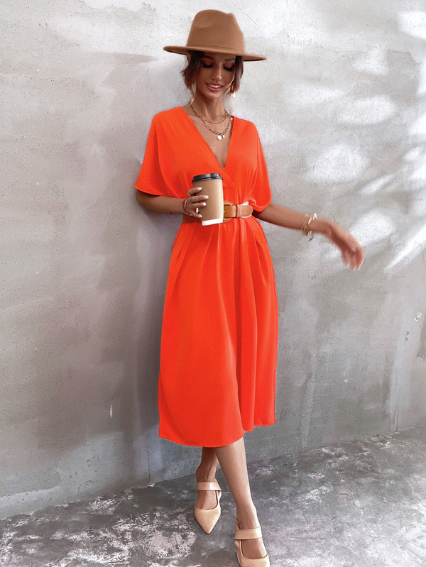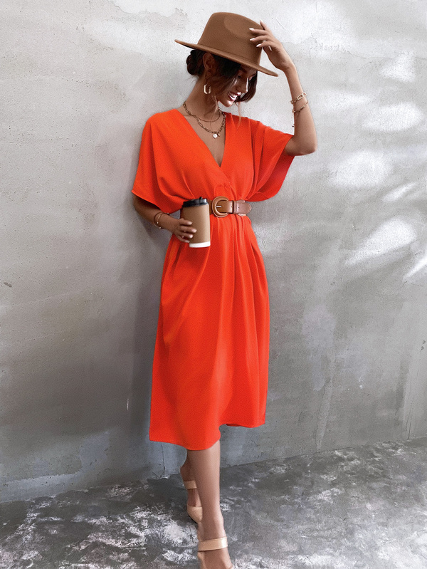 Solid Plunging Neck Dress Without Belt