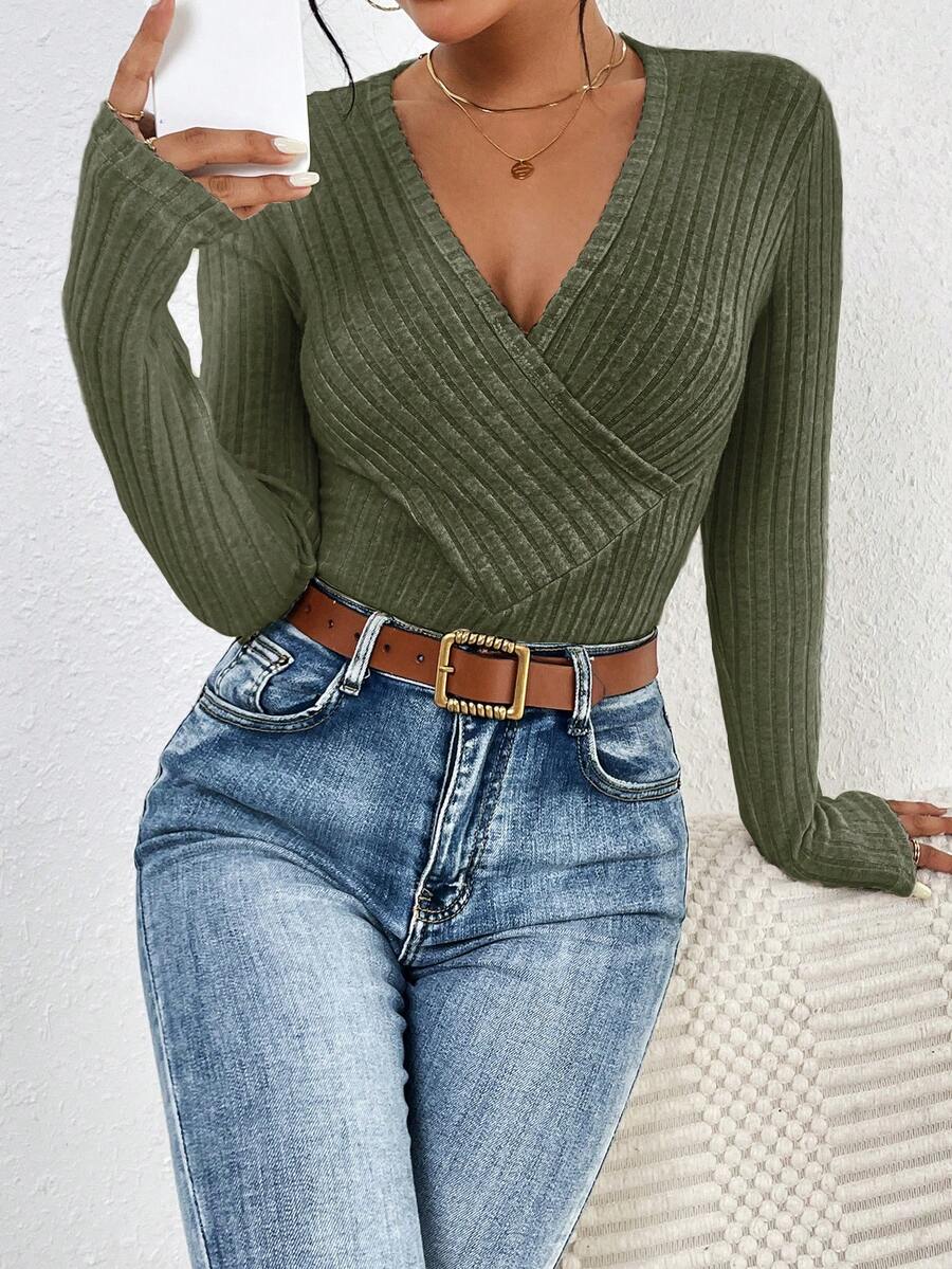 SHEIN Frenchy Solid Ribbed Knit Surplice Neck Bodysuit