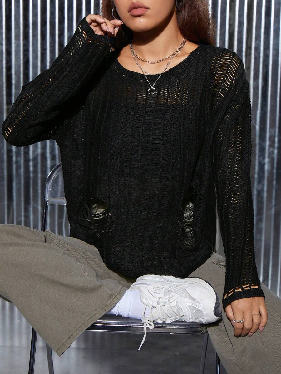 SHEIN PETITE Solid Ripped Drop Shoulder Sweater