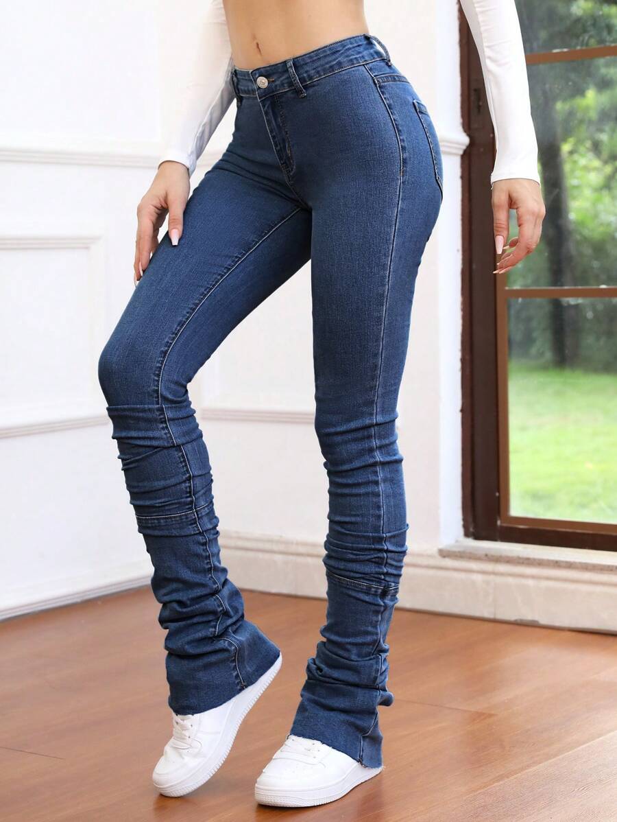 SHEIN Frenchy Solid Ruched Stacked Skinny Jeans