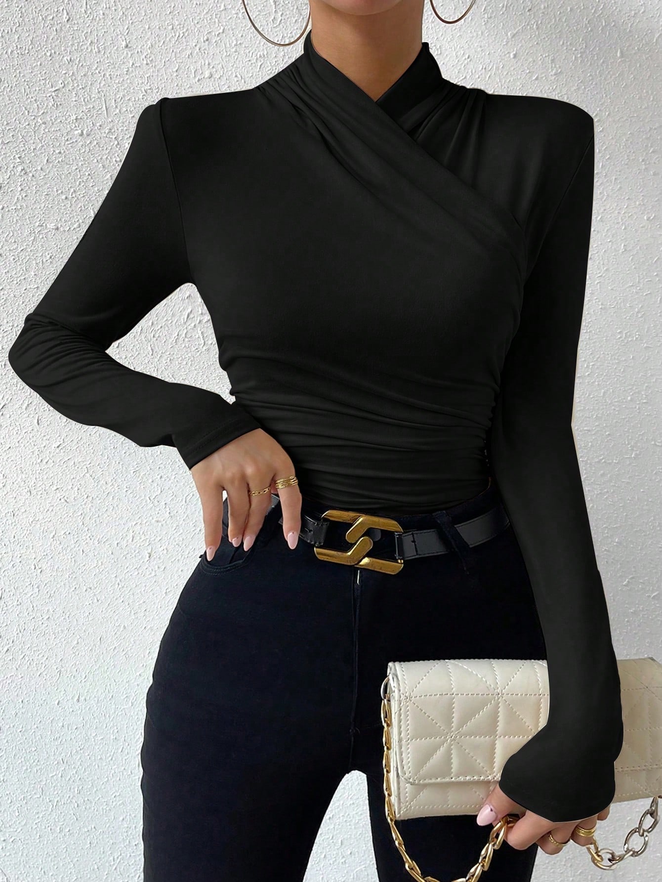SHEIN Essnce Solid Ruched Wrap Cross Tee