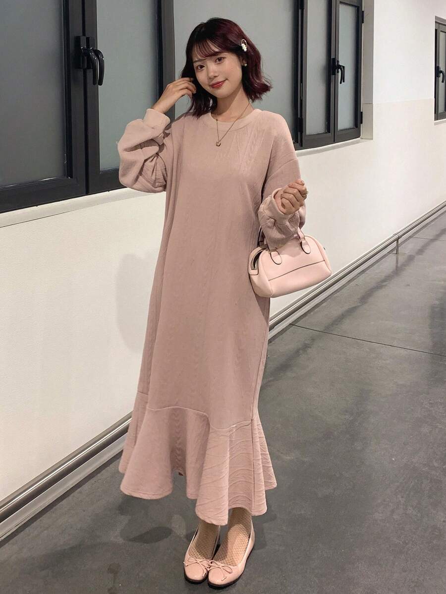 FRIFUL Solid Ruffle Hem Smock Dress