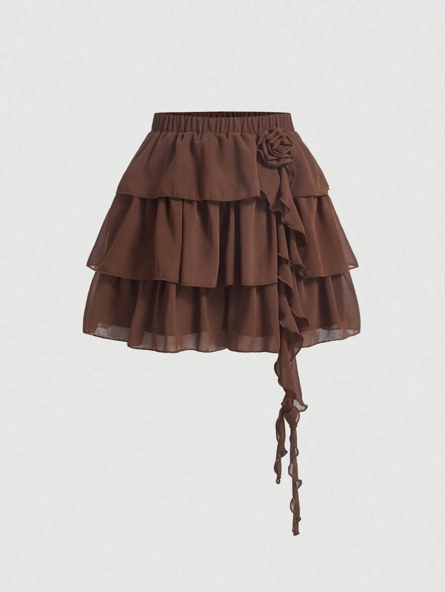 SHEIN MOD Solid Ruffle Trim Floral Decor Skirt