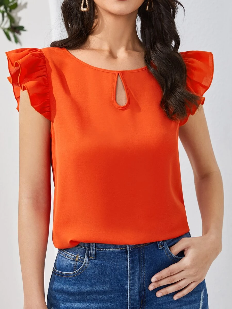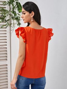 SHEIN VCAY Solid Ruffle Trim Keyhole Neck Blouse