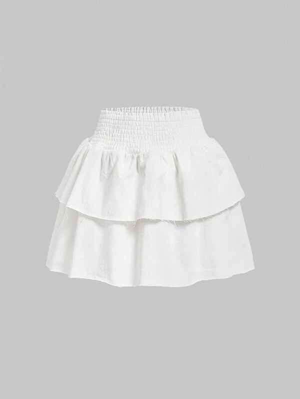 SHEIN MOD Solid Shirred Waist Layered Ruffle Hem Denim Skirt