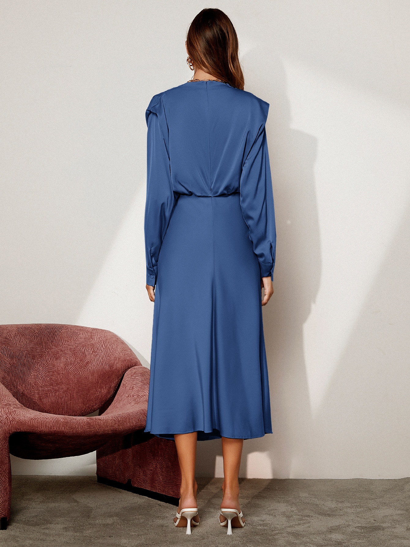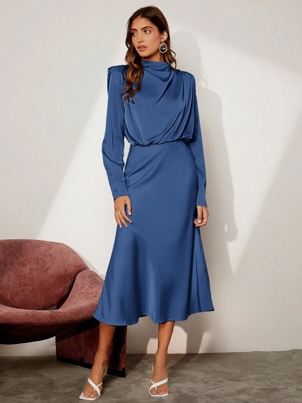 SHEIN BIZwear Solid Shoulder Pad Satin Dress