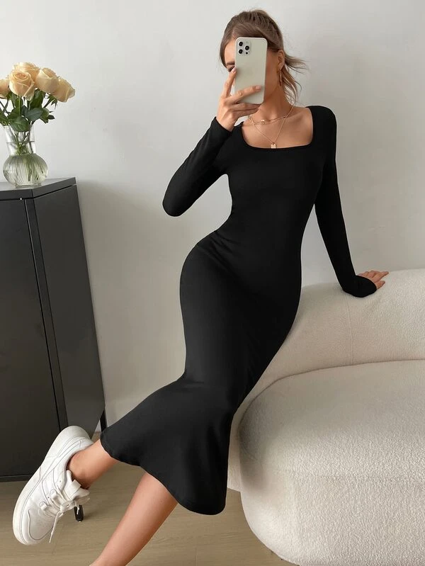 SHEIN EZwear Solid Square Neck Bodycon Dress