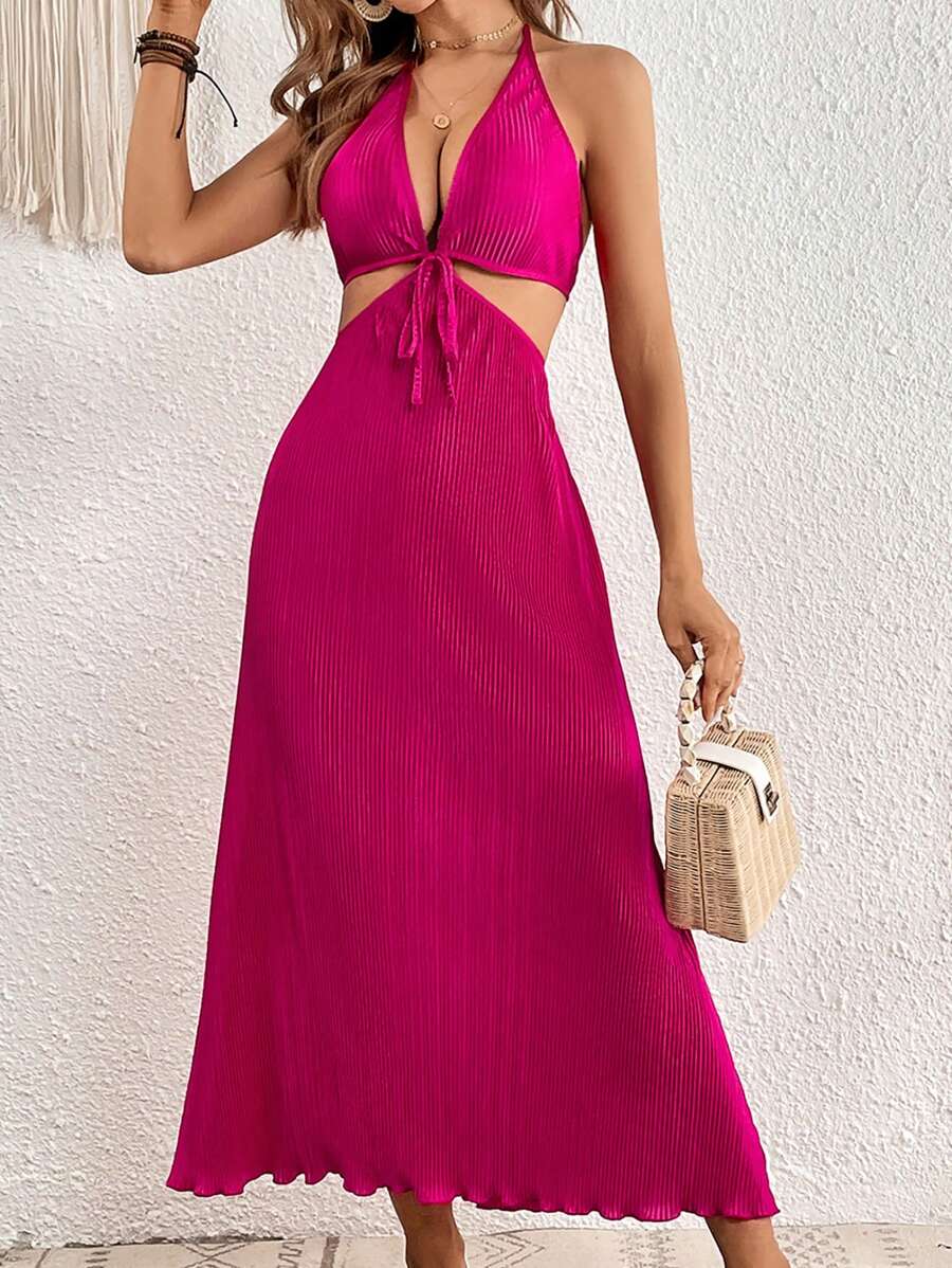 SHEIN VCAY Solid Tie Backless Halter Neck Dress