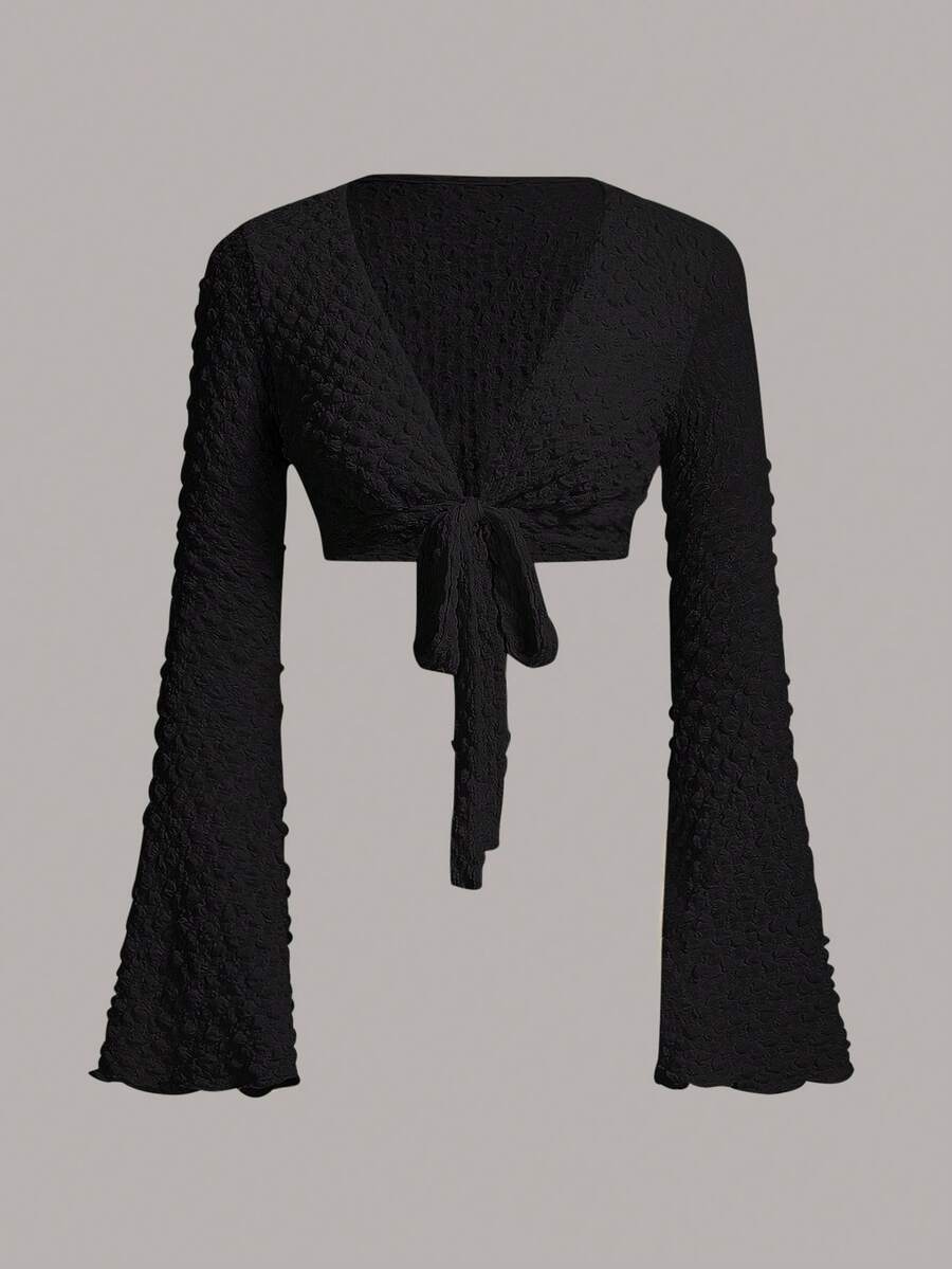 SHEIN ICON Solid Tie Front Trumpet Sleeve Crop Top