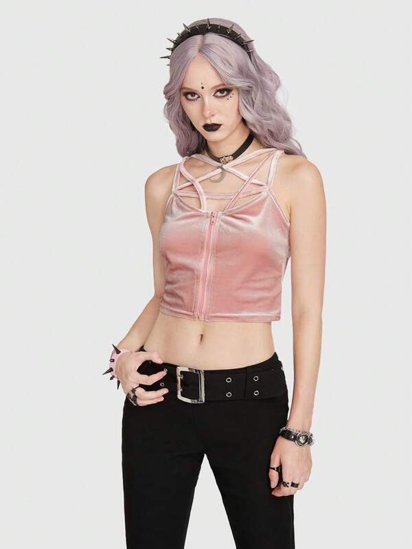 ROMWE Goth Solid Zip Up Velvet Cami Top