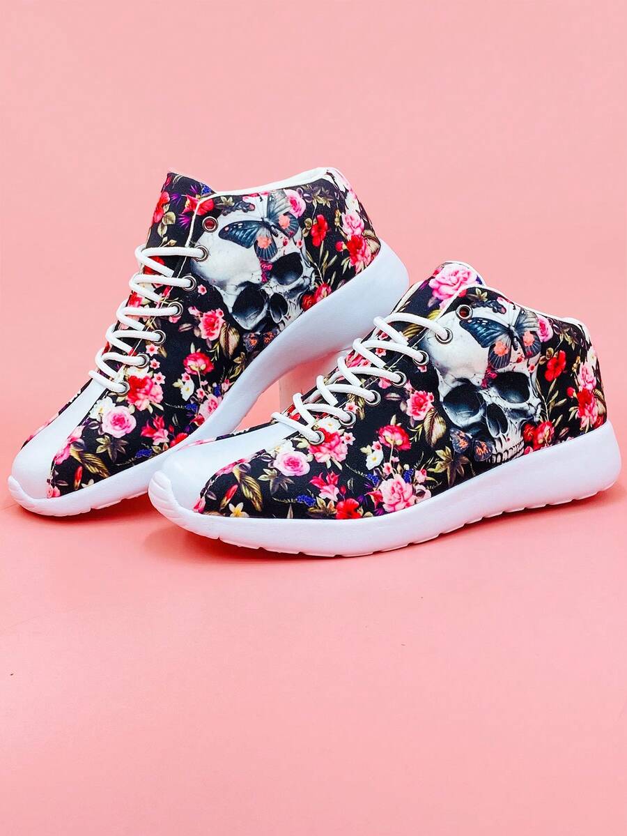 Sporty Running Shoes For Women, Floral & Skeleton Pattern Lace-up Front Sneakers