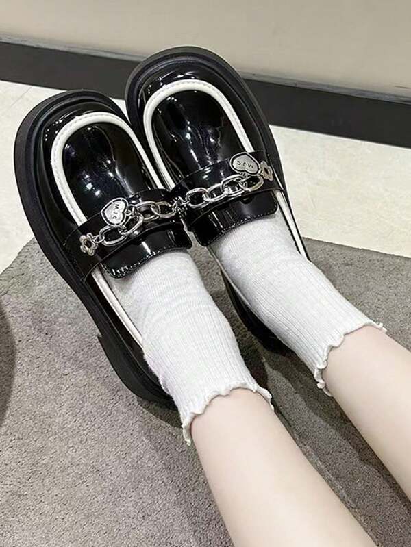 Spring And Autumn New Women'S British Wind Chelsea Shoes, Heart-Shaped Chain Buckle Thick Bottom Slope Heel Round Head Soft Sole Slip-On Comfortable Women'S Shoes