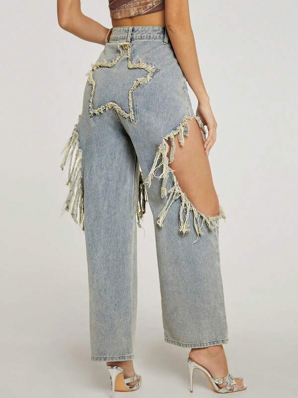 Katalyst Kouture Star Pattern Cut Out Raw Trim Wide Leg Jeans