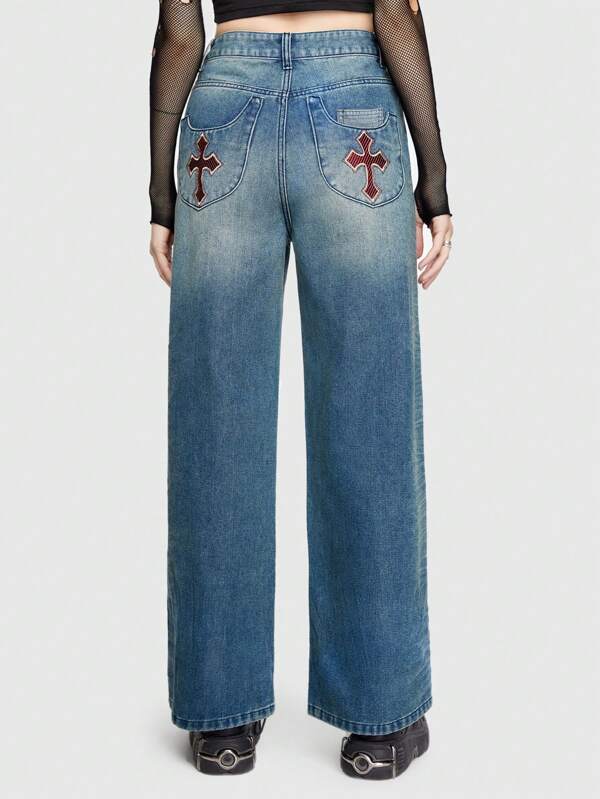 ROMWE Grunge Punk Straight Leg Denim Jeans With Cross Print