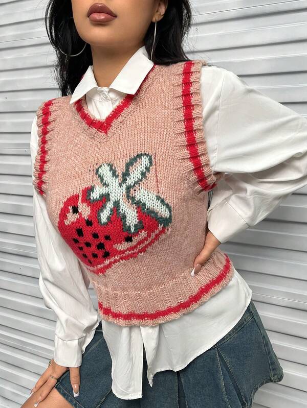 SHEIN Qutie Strawberry Pattern Striped Trim Sweater Vest Without Blouse