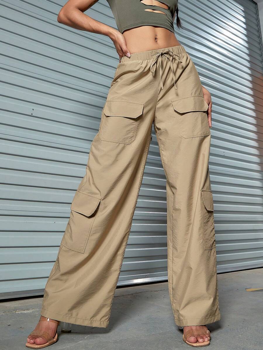 Street Flap Pocket Side Drawstring Waist Wide Leg Cargo Pants