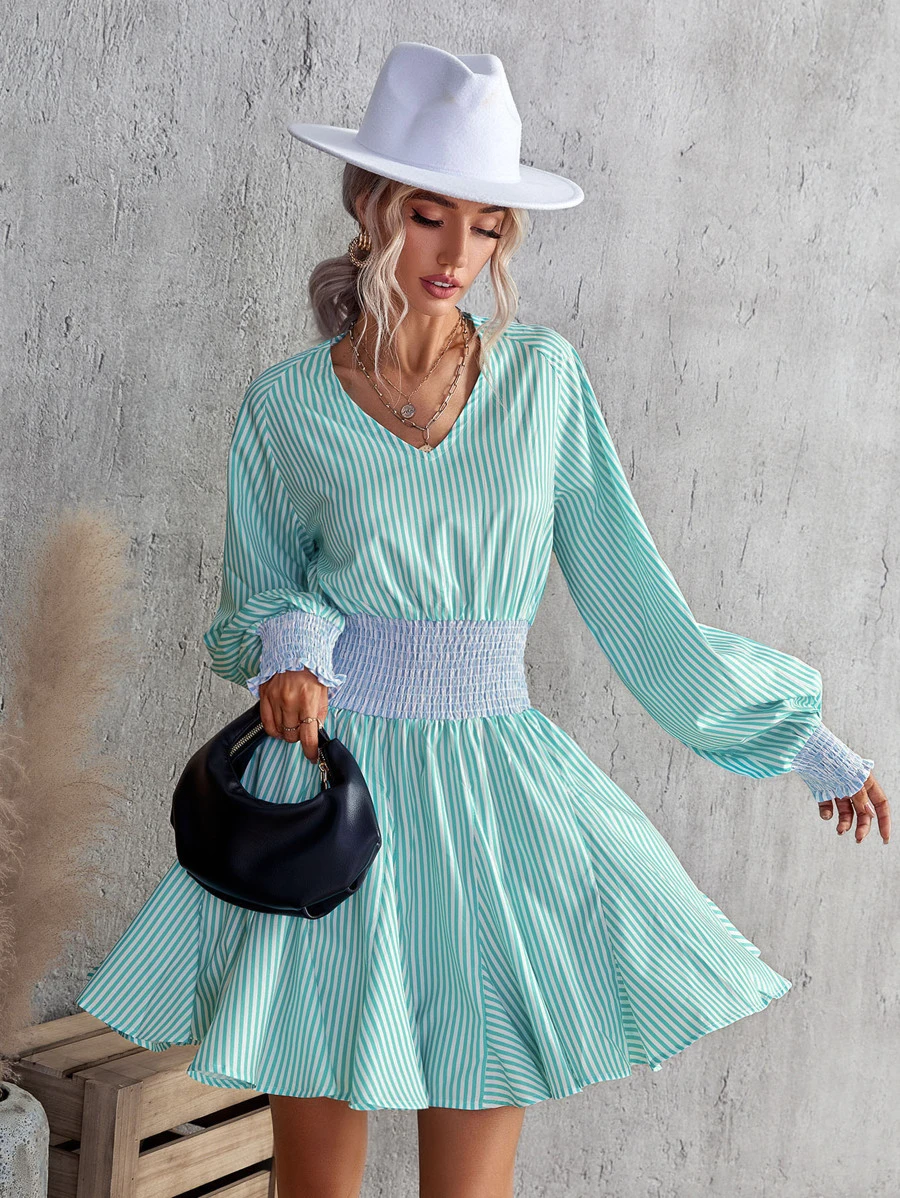 SHEIN Unity Stripe Lantern Sleeve Shirred Waist Dress